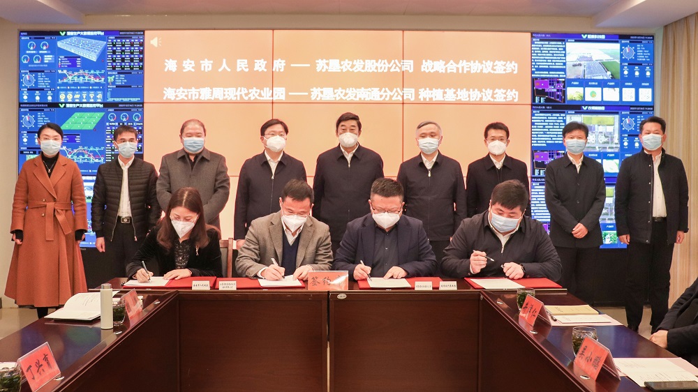 12月16日上午,苏垦农发股份公司与海安市人民政府战略合作协议签署仪式在海安雅周现代农业园举行。集团公司总经理、苏垦农发股份公司董事长胡兆辉,海安市市长谭真出席仪式并致辞,苏垦农发股份公司总裁朱亚东与海安市副市长周平分别代表双方签署战略合作协议。 胡兆辉对海安市长期以来给予江苏农垦的关心支持表示感谢,向协议的签署表示祝贺,并介绍了集团公司历史沿革和改革发展取得的显著成效。胡兆辉指出,双方长期保持着密切合作,共同肩负保障国家粮食安全的政治责任,在建设高标准农田、创建国家现代农业产业园、打造全省一流的粮食生产示范基地等方面目标吻合、方向一致。今年以来,双方继续深化合作,积极推动建立苏垦农发南通分公司海安基地,着力打造辐射带动周边的绿色稻米产业基地、粮油轮作示范基地、现代农业示范基地。胡兆辉表示,双方要紧紧围绕党的二十大精神,沿着习近平总书记指引的方向深耕农村、深化合作,实现资源共享、优势互补,共扩种植规模、共建种繁基地、共创示范效应,携手打造省属国企和地方合作的标杆典范。 谭真代表海安市委市政府对胡兆辉一行的到来表示欢迎,对江苏农垦长期以来关心支持海安“三农”事业发展表示感谢