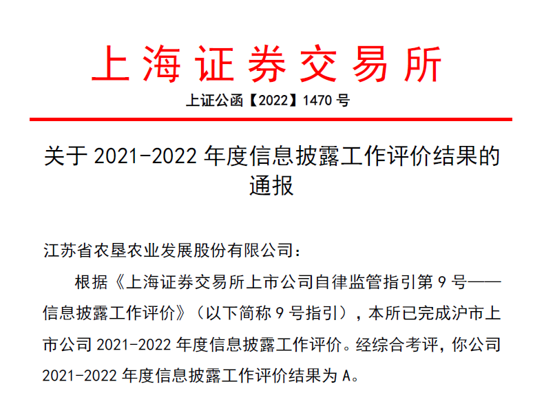 近日,上海证券交易所公布沪市主板上市公司2021-2022年度信息披露工作评价结果,苏垦农发(股票代码:601952)获评最高等级“A”级,这是苏垦农发连续第三年获得信息披露工作最高等级评价。上交所上市公司信息披露工作评价是对上市公司信息披露质量及相关工作的综合评价,本期参与评价的沪市1642家上市公司中,考核结果为“A”级的公司300家,占比18.27%。A类公司中,多为细分行业龙头企业,日常信息披露质量较高,本次评价结果是对苏垦农发严格履行信息披露义务、持续提升信息披露质量的充分肯定,也是对公司治理规范化水平、投资者关系管理和诚信经营的高度认可,将进一步提升公司在资本市场中的形象,对未来的资本运作、市值管理等工作打下基础。评价期内,苏垦农发主动适应政策环境变化,积极作为,主要围绕以下两个方面的核心工作,不断提升公司信息披露质量:一是及时修订并严格执行信息披露事务管理制度,确保对外公告真实、准确、完整、公平、及时。公司根据最新规则要求,对6项与信息披露直接相关的管理制度进行相应的修订,进一步巩固了合法规范、完整齐备、操作性强的信息披露管理制度体系;依法依规及时披露各类公告50余份,内