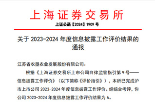 近日,上海证券交易所(以下简称“上交所”)完成对沪市上市公司2023—2024年度信息披露工作评价,经综合考评,苏垦农发(股票代码:601952)在2023-2024年度上海证券交易所的信息披露工作考核中,获评最高等级“A”级,上市以来,苏垦农发连续5年获此殊荣。 据统计,本期参与评价的沪市2247家上市公司中,考核结果为“A”级的公司425家,占比18.91%。A类公司中,多为细分行业龙头企业,日常信息披露质量较高,苏垦农发连续5年获得A级评价,体现了证券监管机构对公司严格履行信息披露义务、持续提升信息披露质量的充分肯定,也是对公司规范运作水平、投资者关系管理、稳健经营和股东回报的高度认可。 未来,苏垦农发将继续以高质量发展为指引,不断提高信息披露质量,提升规范运作水平,努力回馈投资者对苏垦农发的信任与支持,为资本市场的健康稳定发展贡献更大的力量。