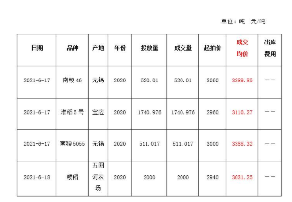 6月18日,最低收购价稻谷(2017-2020年)交易计划销售1814901吨,实际成交56822吨,较上周增加5247吨,成交率3.13%,最高成交价3030元/吨,最低成交价2420元/吨,成交均价2643.08元/吨,较上周上涨1.85元/吨。
