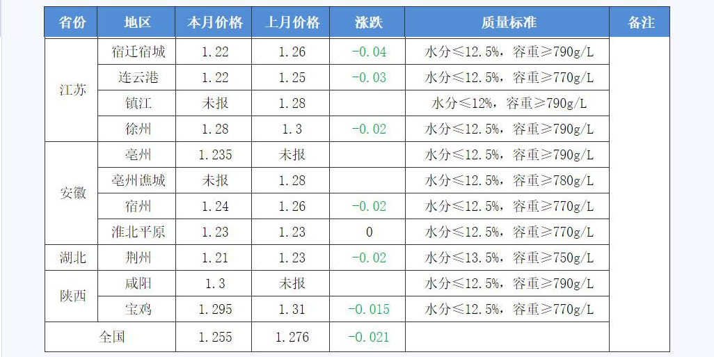 本月国内小麦价格滞涨回落。截止月末,全国小麦平均价格数 为1.255元/斤,较上月跌0.021元/斤,国内主产区面粉企业小麦收购价在1.21-1.30元/斤,较上月波动0.005-0.04元/斤。