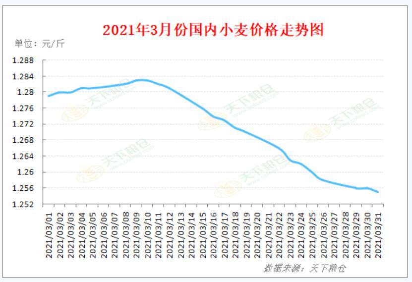 3月1日-3月31日,国内小麦价格滞涨回落。各地小麦价格月度变化情况如下: