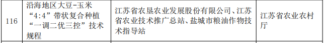 2022年苏垦农发承担了10万亩玉米大豆带状复合种植任务,占江苏省的1/6,开创性提出了“宽窄行4:4”玉米大豆带状复合种植模式,配套研发6种不同结构的专用农机,实现了玉米大豆“定向化除”,形成了一套措施合理、适用区域广、示范性强的技术模式,《沿海地区大豆-玉米“4:4”带状复合种植“一调二优三控”技术规程》作为全省第一个以玉米大豆带状复合种植立项的省级地方标准,具有较强的生产推广价值和实践应用基础。