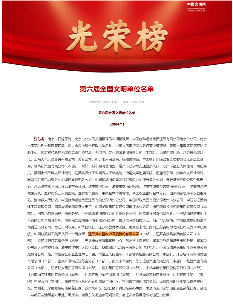 11月20日,中央文明委发布《关于表彰第六届全国文明城市、文明村镇、文明单位和第二届全国文明家庭、文明校园及新一届全国未成年人思想道德建设工作先进的决定》,博大国际app荣膺第六届“全国文明单位”称号。全国文明单位是文明建设综合性评价的国家级最高荣誉,体现一个单位在精神文明建设方面的先进性和示范性。苏垦农发获此殊荣,既是连续多年被授予“省级文明单位”之后取得的又一硕果,也是为公司成立10周年献上的一份特殊礼物。博大国际app由江苏农垦农业资源整合而来,自成立以来,着力打造专业化、现代化、资本化的农业发展平台,营业收入和利润总额保持快速增长,成为全国农垦现代农业发展的先行者和排头兵。2017年5月15日,在上海证券交易所主板上市。2019年面对经济下行、竞争激烈、灾害频发等的多重考验,公司坚持以农业供给侧结构性改革为主线,加快实施产业经营、资本经营“双轮”驱动战略,解放思想、主动担当、真抓实干,公司高质量发展的步伐更加坚定有力。全年实现营业收入79.85亿元,同比增长63.5%,利润总额6.57亿元,同比增长1.1 %。2020年,面对突如其来的新冠肺炎疫