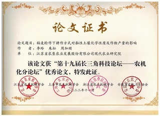 苏垦农科院获得“第十九届长三角科技论坛-农机化分论坛”优秀论文奖