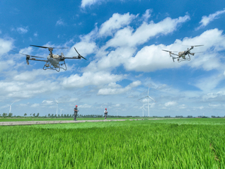7月21日,苏垦农发新洋分公司组织植保无人机对高标准农田中的水稻进行综合田管作业。