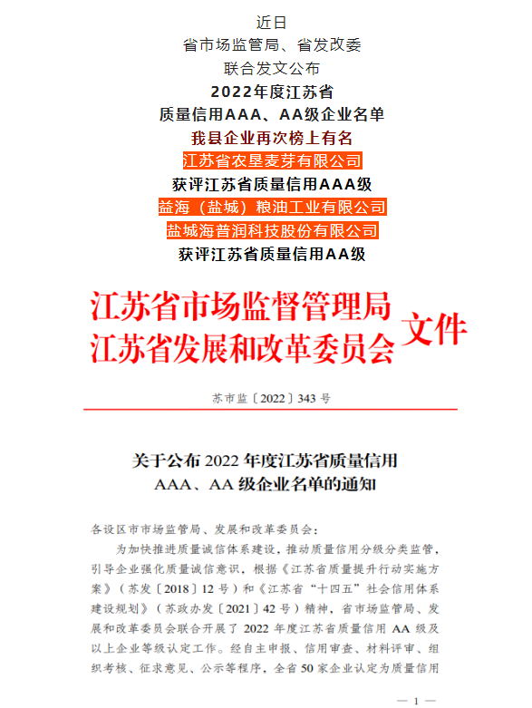苏垦麦芽荣获2022年度江苏省质量信用AAA级认定